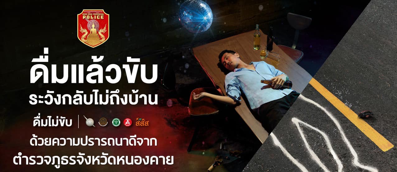 ในวันปีใหม่ พวกเราห่วงใย ดื่มไม่ขับ ถ้าดื่มแล้วขับ ระวังกลับไม่ถึงบ้าน ด้วยความปรารถนาดี จากเจ้าหน้า