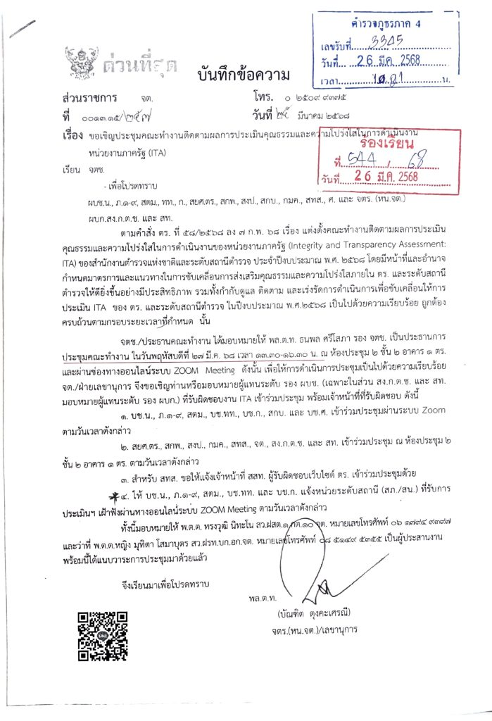 เรื่อง แต่งตั้งคณะทำงานขับเคลื่อนและกำกับติดตามการประเมินคุณธรรมและความโปร่งใสในการดำเนินงานของหน่วยงานภาครัฐ(Integrity and Transparency Assessment : ITA)ระดับสถานีตำรวจปีงบประมาณ 2568